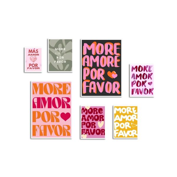 'More Amor Por Favor' postersetet innehåller livfulla och motiverande texter för din väggkonst. Denna samling inkluderar 7 unika posters med texten 'More Amor Por Favor' och 'Más Amor Por Favor' i olika färger och stilar för att lysa upp vilket rum som helst. Perfekt för vardagsrum, sovrum och kontor. Produkter innehåller ett set med 7 wall posters endast.