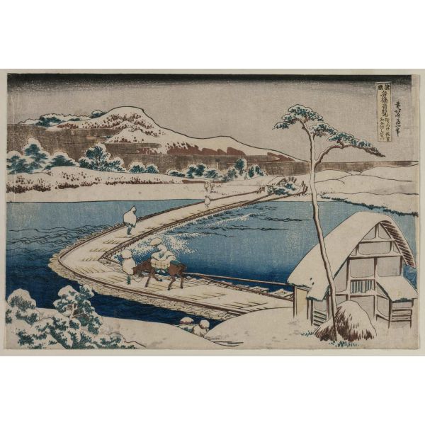 Denna poster visar ett fridfullt vinterlandskap vid en flod, som fångar lugnet i en snöig scen. Inspirerad av traditionella japanska träsnitt, erbjuder den en kulturell touch till alla hem. Konstverket visar en pittoresk bro och figurer insvepta i varma kläder, vilket tillför en berättande dimension till dekoren. Produkten innehåller endast en poster.
